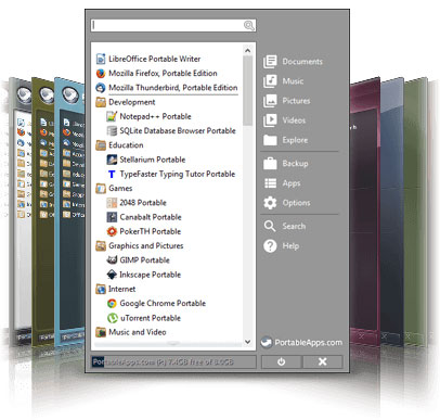 无论您希望菜单看起来是现代的还是复古的,明暗的,玻璃的还是简单的,PortableApps.com平台都为您提供了一个选择。捆绑了十二个主题,每个主题都有多种颜色可供选择,您可以连续数月每天选择不同的外观,而永远不会两次出现相同的菜单。您可以通过在右上角添加自己的个人图片来制作菜单