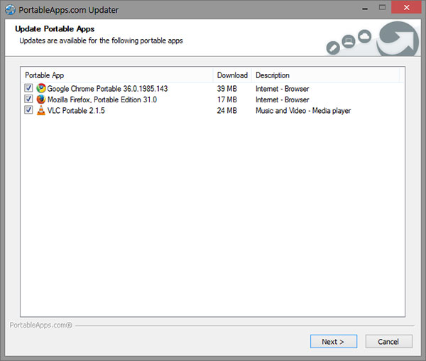 使用PortableApps.com,您无需担心确保软件是最新的。当发布针对您的浏览器的新安全修复程序或您喜欢的游戏中的新功能可用时,PortableApps.com更新程序将自动通知您。只需单击一个按钮,即可下载并安装更新,而不会弄乱您的设置和保存的文件。而且,如果您急于使用计算机或连接速度较慢,则只需单击一下即可等到以后