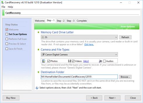 2、用户选择驱动器号,摄像头类型和目标文件夹以保存恢复的文件