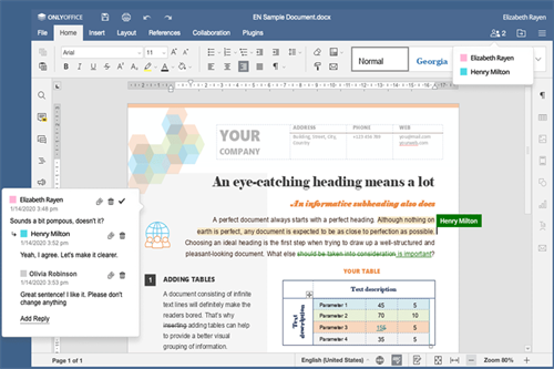 1、一包、三名编辑、多种功能 创建、查看和编辑任何大小和复杂性的文本文档、电子表格和演示文稿。由于基于标签的用户界面,在同一个窗口内处理多个文件。 2、与MS Office和OpenDocument格式兼容 使用最流行的格式:DOC、DOCX、ODT、RTF、TXT、PDF、PDF、HTML、EPUB、XPS、DjVu、XLS、XLSX、ODS、CSV、CSV、PPTX、ODP 3、快速访问广泛的协作功能 连接到服务器并与您的团队进行文档协作:实时协作编辑,审阅,评论以及使用聊天进行交互。 4、第三方加载项 使用集成的附加组件扩展ONLYOFFICE功能或创建自己的附加组件。 5、支持所有流行的平台 Windows 11、10、8、7、XP、2003、Vista(包括32位和64位)、Debian、Ubuntu及衍生产品、基于RPM的Linux发行版、Mac OS 10.10或更高版本。 6、更新和技术支持 免费定期更新。通过论坛为所有技术和功能问题提供快速和专业的帮助。onlyoffice使用说明