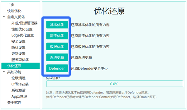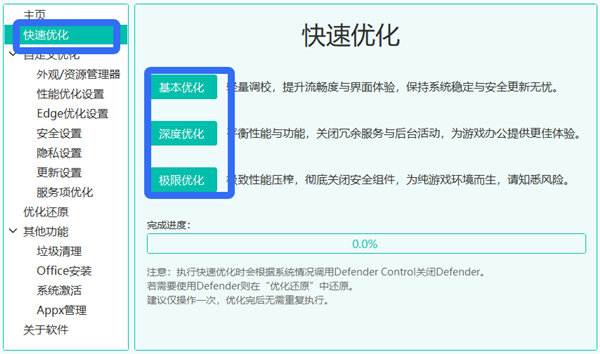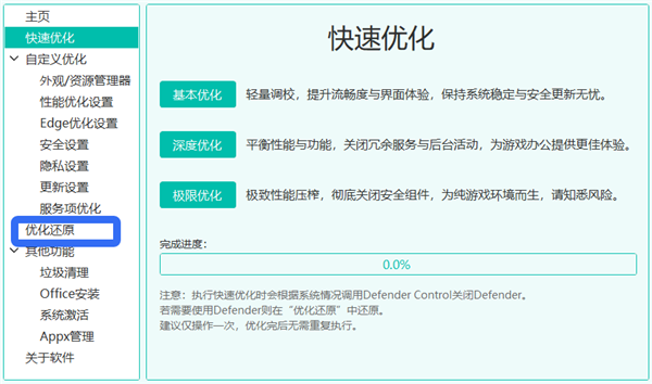 1、一键优化 提供三种模式(基本、深度、极限),适用于办公、游戏等不同场景。 2、自定义优化 可手动选择优化项,涵盖性能、服务、隐私、浏览器等多个维度。 3、垃圾清理 清理系统缓存、临时文件等,释放磁盘空间。 3、系统激活与Office安装 集成多种激活方式,支持一键安装Office套件。 4、Appx管理 可卸载Windows预装应用,释放资源。 5、优化还原 支持一键回退,避免误操作带来的系统问题。ZyperWin++优化工具怎么优化和还原优化