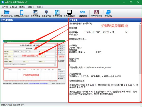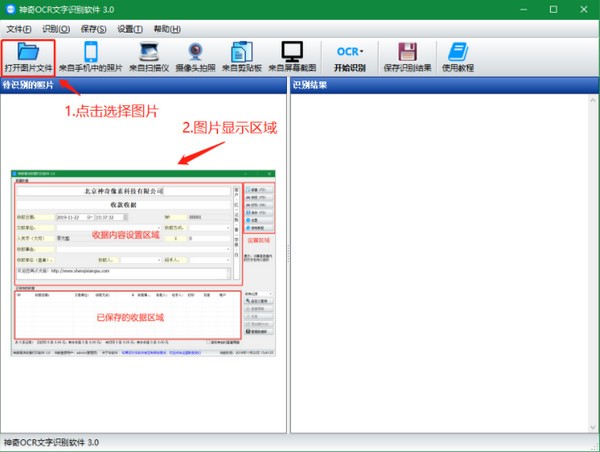 1、第一步:打开等待识别文字的图片,支持图片文件、来自手机中的图片、来自扫描仪的图片、摄像头拍照、来自剪贴板的图片、来自屏幕截图,打开之后图片会显示在左侧“图片显示区域”内