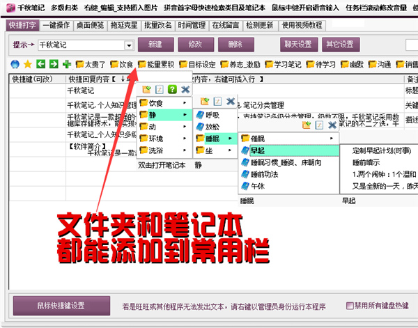 4、极速的笔记提取,实现任意位置输入您的笔记,客服人员不可多得的话术管理及喊话神器哟,旺旺 QQ等,都能一键发出文本和图片,编程人员用来输入代码段,能提高n倍开发效率(偶就是个程序员,此处现身说法),还有其他需要经常录入重复文本的职业,也是不可多得的神器。5、支持将笔记本添加到常用栏目,连文件夹也能添加到常用栏目哟。