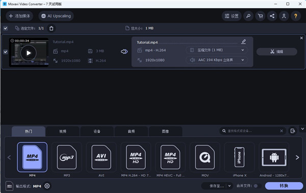 Movavi Video Converter 2025是由Movavi公司开发的一款媒体转换以及编辑的工具,软件功能全面,操作简单,哪怕第一次使用的新手也能轻松上手,能够轻松将视频文件转换为其他格式。除此之外,这款软件的转换功能非常的全面,支持市面上大部分流行的视频、音频和图片的格式转换,包含了MP4、GIF、AVI、MOV、RAW、WMV、DVD、VOB、MKV等180多种格式,可以满足用户的所有影片转换需求。贴心的提供详细的使用教程,让你能够快速上手,轻松掌握视频转换技巧,非常便捷好用。