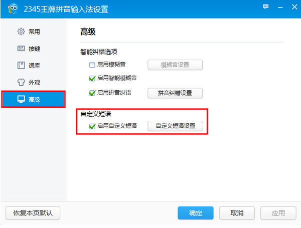 怎样添加自定义短语? 自定义短语是通过特定字符串来输入自定义好的文本,设置自己常用的自定义短语可以提高输入效率,例如使用yx,1=wangshi@sohu.com,输入了yx,然后按下空格就输入了wangshi@sohu.com。使用sfz,1=130123456789,输入了sfz,然后按下空格就可以输入130123456789。 “自定义短语功能”在右键菜单——设置——高级(如图所示)
