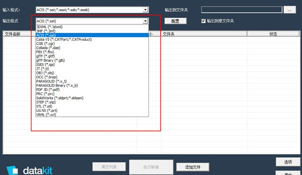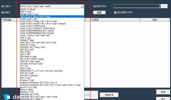 当您单击名为“选择输出格式”的组合框的黑色箭头时,以下是组合框中显示的CrossManager支持的CAD格式列表: