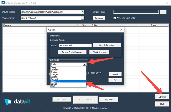 7、双击运行CrossManager 2024,找到选项,选择语言设置简体中文即可;