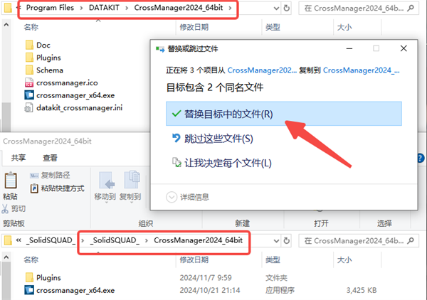 6、右键打开软件安装目录【C:\Program Files\DATAKIT\CrossManager2024_64bit】,将_SolidSQUAD_文件夹中的文件替换安装目录当中的即可;