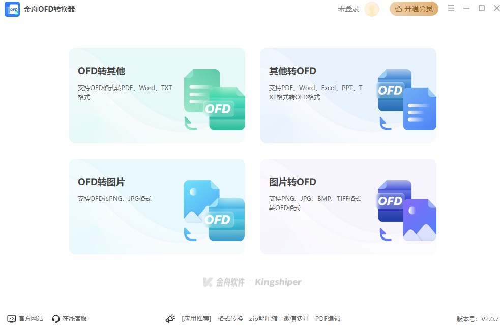 1、OFD转其他 支持OFD格式转换为PDF、Word、TXT格式。 2、其他转OFD 支持PDF、Word、Excel、PPT、TXT格式转OFD格式。 3、OFD转图片 支持OFD转PNG、JPG格式。 4、图片转OFD 支持PNG、JPG、BMP、TIFF格式转OFD格式。金舟OFD转换器电脑版使用教程