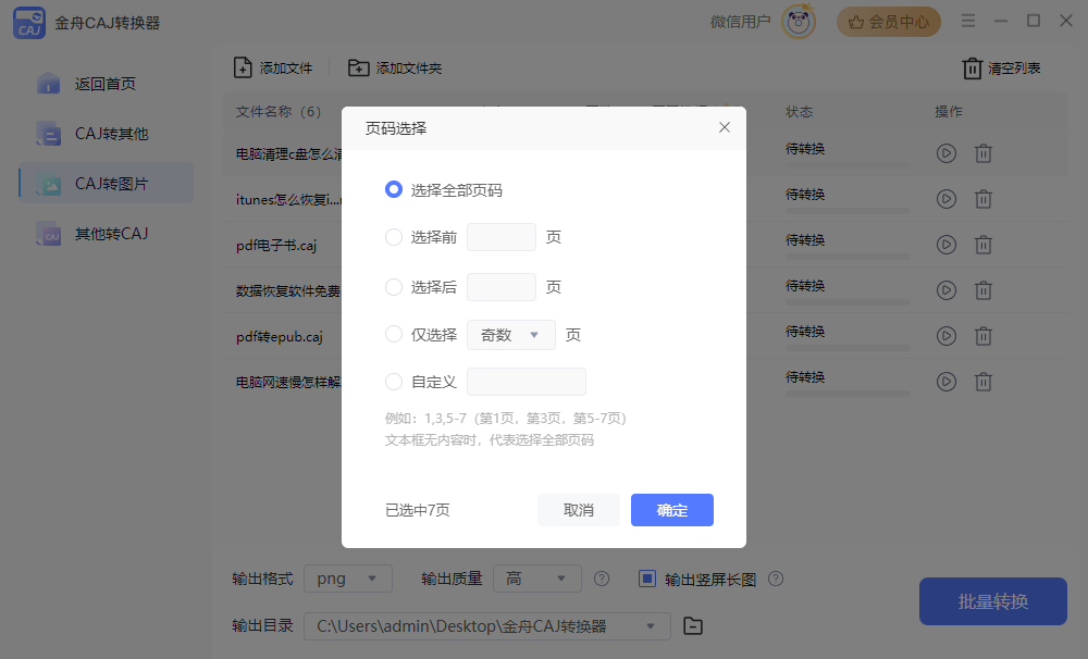 3、页面选择中,可根据需要选择需要转换的页码,默认的是全部;