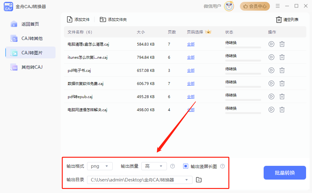4、在下方设置中,选择需要输出的图片格式以及质量,可选择将caj文件页面拼接成一个长图;另外,输出路径可以自定义选择,导出的文件不会覆盖原文件;