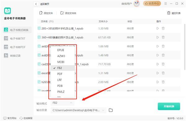 3、点击输出格式下拉按钮,选择需要转换成的电子书格式。