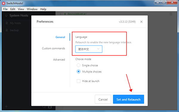 2、在Language下拉框中选择简体中文,再点击Set and Relaunch