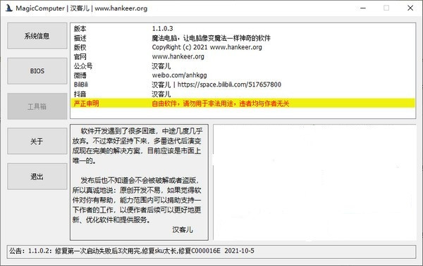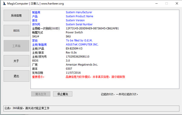 1、软件需要使用网络,请保证网络畅通,否则软件无法使用。 2、关闭360,误报 3、修改bios? 点击蓝色区域,修改即可。修改完成后,检查确认是否修改正确,然后点击魔法生效。 4、获取口令? 公众号“汉客儿”后台回复“魔法”两字即可获取口令。 5、随系统启动? 软件采用模拟方式修改bios,所以退出软件后,模拟失效。为了方便使用,可使用右下角图标右键菜单,选择随系统启动,方便下次开机自动启用。 6、停止魔法 可以随时启用和停止魔法 7、次数不够? 正常使用只要仔细对比,3次修改已经足够。限制次数主要是为了防止软件被滥用,请谅解。如果确实需要增加次数,后续可能会考虑开放接口。 8、初始化检测系统环境失败 刚升级系统或者该版本暂不支持(可尝试更新系统),或者网络环境不佳,多尝试两次。 9、init core service failed:c0000470 BIOS信息被第三方篡改或者破坏。