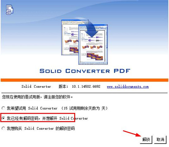 5、此时会提示输入注册,选择“我已经有解码密码,并想解开solid converter”,点击“解锁”