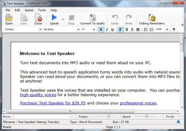 Text Speaker是一款专业的文本转语音软件,该软件可以帮助用户将所需要处理的文本内容直接转换为语音,操作简单,可以自由调节音调、语速、音量以及调整阅读速度,多种功能用户可以设置最舒适的使用方式。同时软件支持多种语言,通过输入文字,设置转换的编码以及声音的输出类型,就能轻松得到转换的语音文件。软件非常适用于每天都需要接触大量文字的用户,可以用于创建叙述教程、营销视频、校对文本文件以及穿件语音提示的制作等多种操作方式,操作简单,能够满足不同用户的基本使用需求,多种格式的转换,音质的效果非常棒。随时随地都可以收听文本内容,帮助用户提高工作效率。