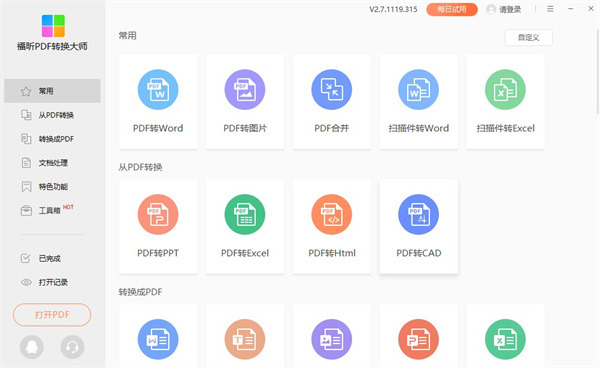 福昕PDF转换大师是一款一站式PDF在线转换工具,支持在线PDF转换Word、Excel、PPT、图片等多种文件格式,及PDF压缩、合并和拆分等需求。它能够将PDF文档中的文字,图片,表格,注释等等文档元素相对应的转换成word文档中相对应的文档元素。福昕PDF转换大师支持扫描件转换、以及PDF转Word、图片、PPT、Excel、Html的操作,支持反向操作。除此之外,还支持进行PDF合并、拆分、压缩、自动翻译、旋转等功能,拥有精准OCR识别,准确识别PDF扫描件,准确度高,需要的朋友不要错过这么好的软件哦。