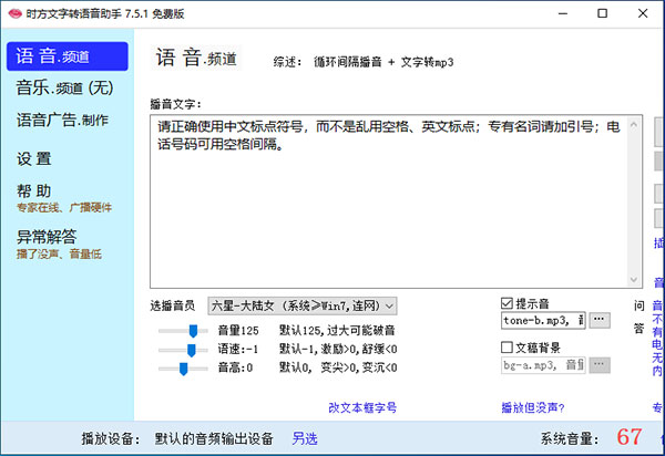 时方文字转语音助手是一款专业的门店播音软件。只需在软件中输入广告词,就可以轻松的进行宣传。并且文字转语音助手免费版支持多种播音语言,你甚至可以调节音量、语速等,除了生成文件放到MP3等设备上进行播放,也可以直接输入后用电脑和音响播放,有需要的用户不要错过哦。