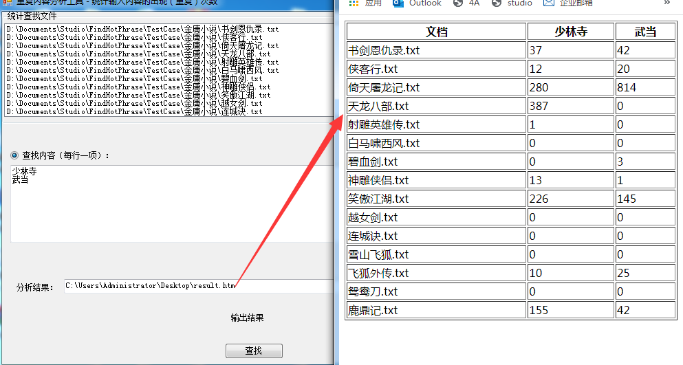 在此功能界面,输入重复词进行统计,结果会展示在哪些文件中出现(重复)多少次:
