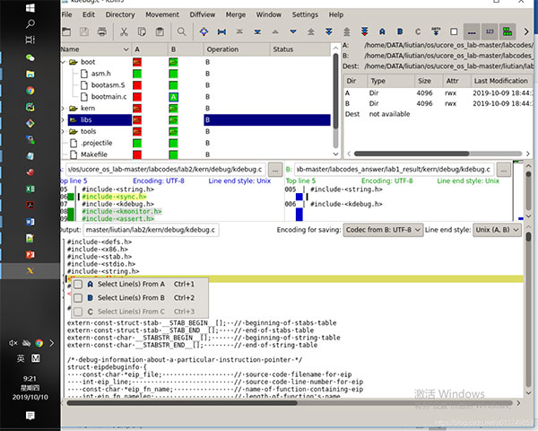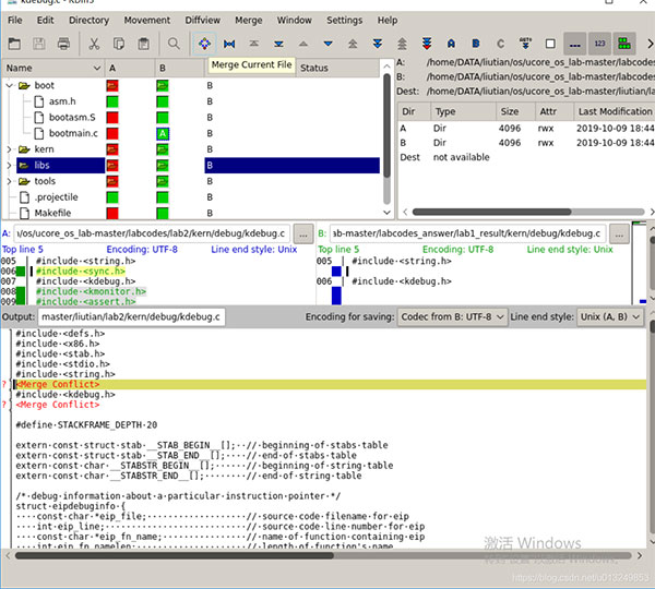 KDIFF3 可以两份、三份文件可以自动合并。当文件合并遇到冲突会显示在窗口下方的编辑页面。并且可以点击窗口中的ABC来选取你使用哪一份代码。