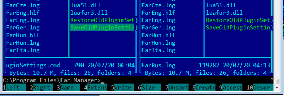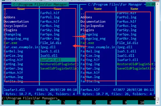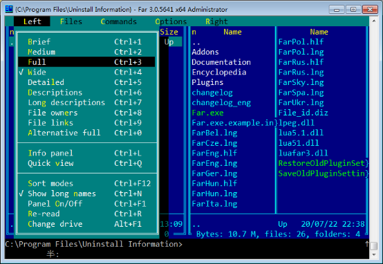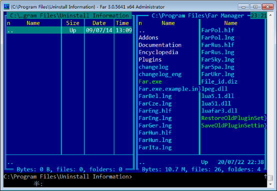 Far Manager中文版是一款简便易用的文件管理软件。使用它,可对C、D、E..盘中任意文件进行复制、移动、删除和编辑等操作,还能对整个文件夹目录进行管理。软件分为几个窗口,左侧界面为操作前的界面,右侧界面为操作后的界面,所有文件均可在两侧被直观看到,极其方便,并且支持长文件名和中文文件名,可实现直接对目录进行操作,速度快,效率高,因而深受大众喜爱。另外,Far Manager还包含了众多的插件和外挂插件供用户自由设置。