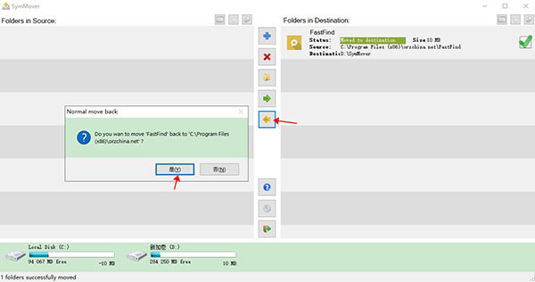5、一键将选定的文件夹移回其原始位置。SymMover将删除符号链接,然后将文件夹移回。