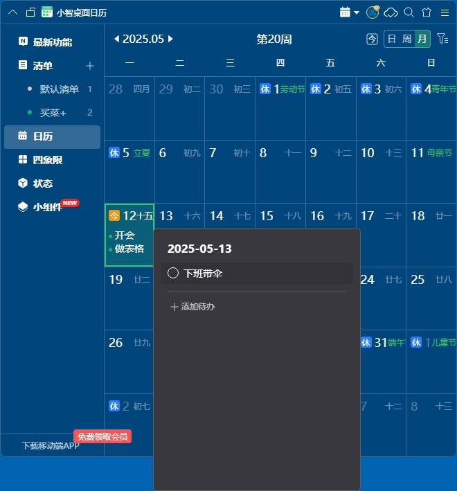 小智ToDo电脑版还提供日/周/月日历视图及清单模式,支持按时间、状态或自定义排序,兼顾长短期规划与优先级管理。个性化功能更涵盖主题皮肤、桌面小组件及多样化提醒方式(弹窗、声音),同时作为免费软件无功能限制,兼顾安全性与实用性。