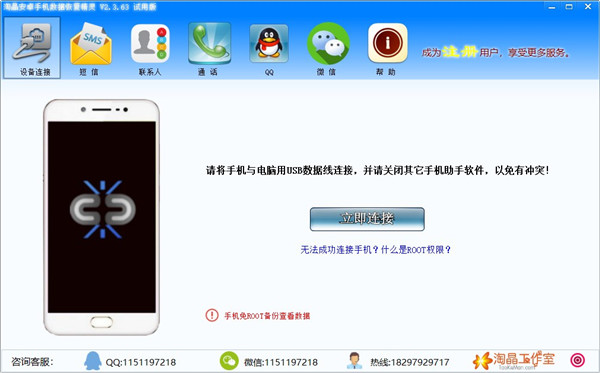 安卓手机中的QQ聊天数据存放在手机的“/data/data/com.tencent.mobileqq/”目录中,需要有ROOT权限 才能操作此目录。1、在电脑上下载"淘晶安卓手机数据恢复精灵",把手机用数据线连接电脑。