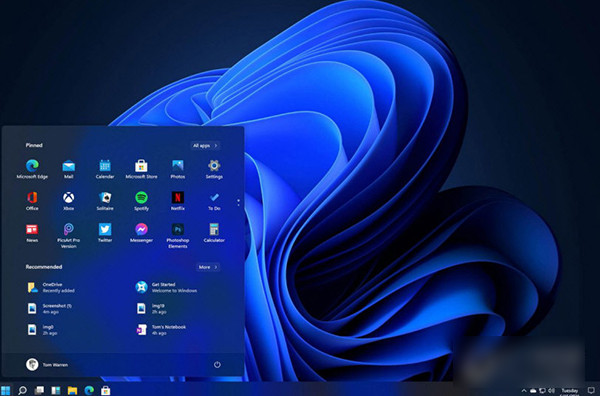 从视觉上看,最大的变化在任务栏上,微软将应用图标放在了任务栏的中心位置,清理了托盘区域,并采用了一个新的开始按钮和菜单。