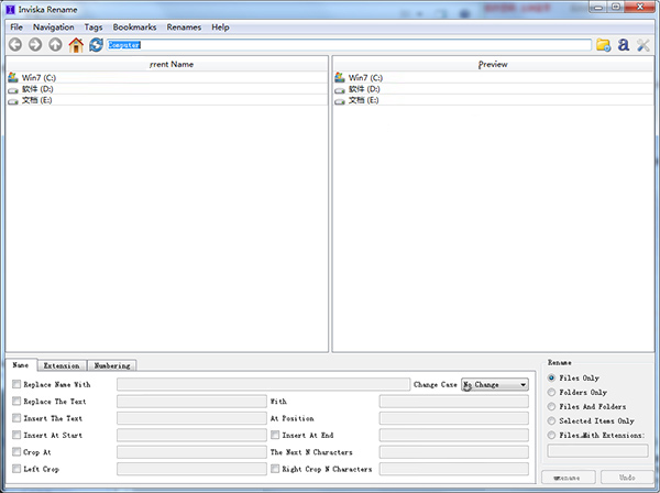 运行后,Inviska Rename界面的中间左侧部分【current name】和资源管理器一样,你可以使用它浏览到需要批量重命名的文件夹路径下,中间右侧