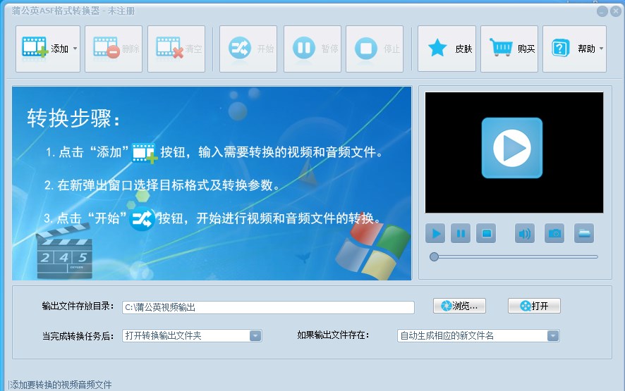 蒲公英ASF格式转换器官方版是一款功能强大、界面简洁、操作简单、实用性强、并专门针对ASF格式进行转换的软件。蒲公英ASF格式转换器能够非常快速的将ASF或者WMV格式转换成常用的视频格式,比如将ASF或WMV转换为AVI, MPG, MPEG, MP4, VCD, VOB, MTS, RM, RMVB, MKV, 3GP, 3G2, FLV, SWF, VOB, MOV等视频格式。反之,也可以将各种流行的视频格式转换为标准的ASF或WMV格式。软件还支持ASF或WMV格式到各种音频格式的转换,比如您可以将ASF格式转换为MP3、ASF转换为WMA、WMV转换为WMA、ASF转换为WAV等格式。这样您就可以将网上下载的ASF或WMV格式转换为各种移动设备所能播放的视频或音频格式。蒲公英ASF格式转换器采用先进的视频编码解码技术,所以转换视频速度非常的快,转换视频质量也是非常的高。蒲公英ASF格式转换器还支持各种视频文件的播放预览,支持更换软件皮肤,操作极为简单,支持批量转换,支持自动关机。是不是心动了啊,有需要的朋友可以体验一下,你值得拥有哦。