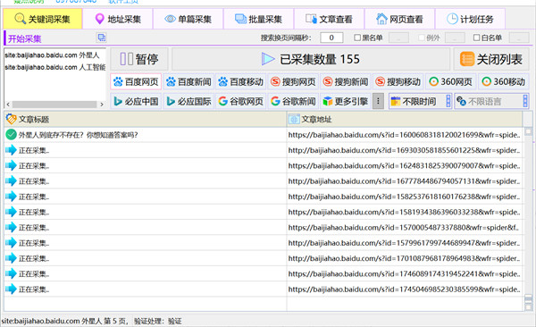 2. 只需输入关键词,就能采集到微信文章、今日头条、一点资讯、百度新闻和网页、搜狗新闻和网页、360新闻和网页、谷歌新闻和网页、必应新闻和网页、雅虎新闻和网页;可批量关键词全自动采集。