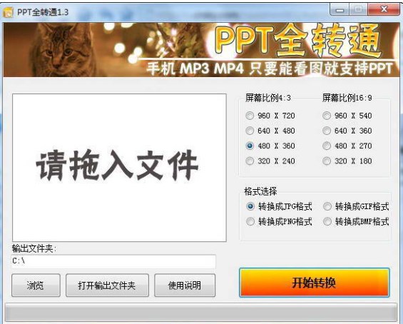 PPT全转通是一款体积小巧、绿色免费、功能实用的PPT文件转换工具软件。PPT全转通能够批量转换PPT格式的文件变为几种常见图片格式,例如:JPG、GIF、PNG、BMP。有了PPT全转通,可以让您的MP4、手机也能看ppt文件你们的图片,支持Microsoft PPT,WPS PPT等多重格式。PPT全转通可以将图片上传到您的手机、MP4即可观看PPT。简单来说,是可以让PPT在任意手机、MP4等支持图片查看功能的机器上播放PPT的软件,有需要的朋友可以下载看看哦。