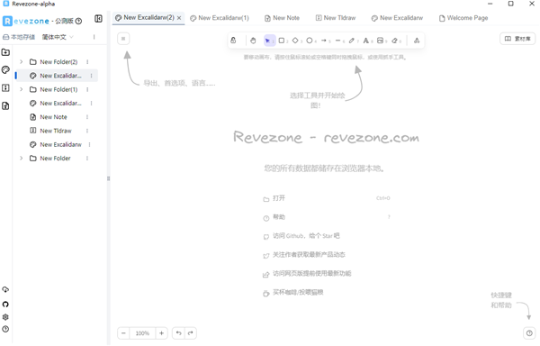 Revezone是一款轻量级的本地第一图形为中心的生产力工具,以建立您的第二个大脑。Revezone支持用户新创Excalidraw白板、Tldraw白板、笔记,你可以在Revezone中以一种新的更简单的方式使用Excalidraw,甚至可以在桌面应用程序中自定义字体,并通过double link在Revezone中链接笔记,笔记是一个所见即所得的类 Notion 编辑器,支持 '/' 命令和 Markdown 语法,您可以在左侧边栏中创建和管理文件夹/便笺/留言板,通过拖拽来排序目录和分屏。