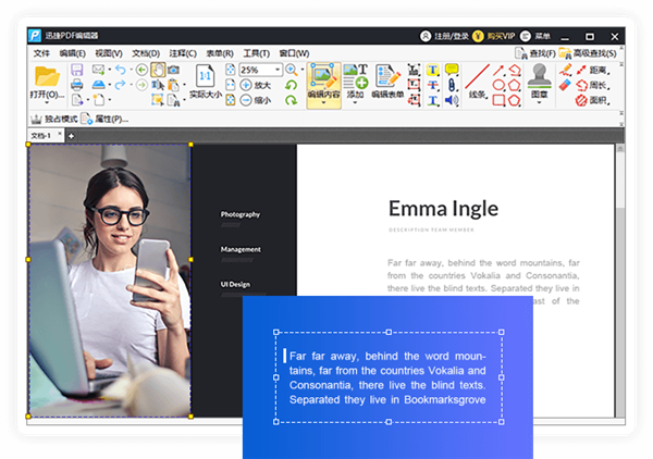 1、完整的PDF编辑功能 软件不仅仅可以对PDF文件中的文本内容进行编辑,还可以对图片、多媒体等内容进行处理,用户能够根据需求编辑个性化PDF文档。 2、简单的编辑操作方法 软件界面工具栏一目了然,操作简单,任何用户都可以轻松掌握软件,进而对PDF文件进行编辑处理。 3、特色的PDF创建功能 除了可以对原有的PDF文档进行编辑之外,迅捷PDF编辑器支持创建一个全新的PDF文件,从头编辑一份完整的PDF文档。 4、良好的PDF阅读体验 针对不同分辨率显示效果进一步优化,支持PDF文件显示比例调整,为用户提供良好的PDF阅读效果。 5、强大的文档加密管理 软件可一键对编辑完成的PDF文档进行加密,也可以对标记的部分PDF文件进行加密,有效防止数据泄露。 6、自定义的表单编辑功能 用户可在PDF文件的表单中,随意修改、删除、导入或导出表单数据,对现有的PDF文件表单数据进行重新编辑。迅捷pdf编辑器官方版使用教程