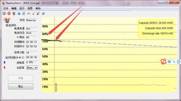4、等待采样一段时间后即可查看电池放电情况,其中横坐标表示采集时间、纵坐标表示电池的电量。