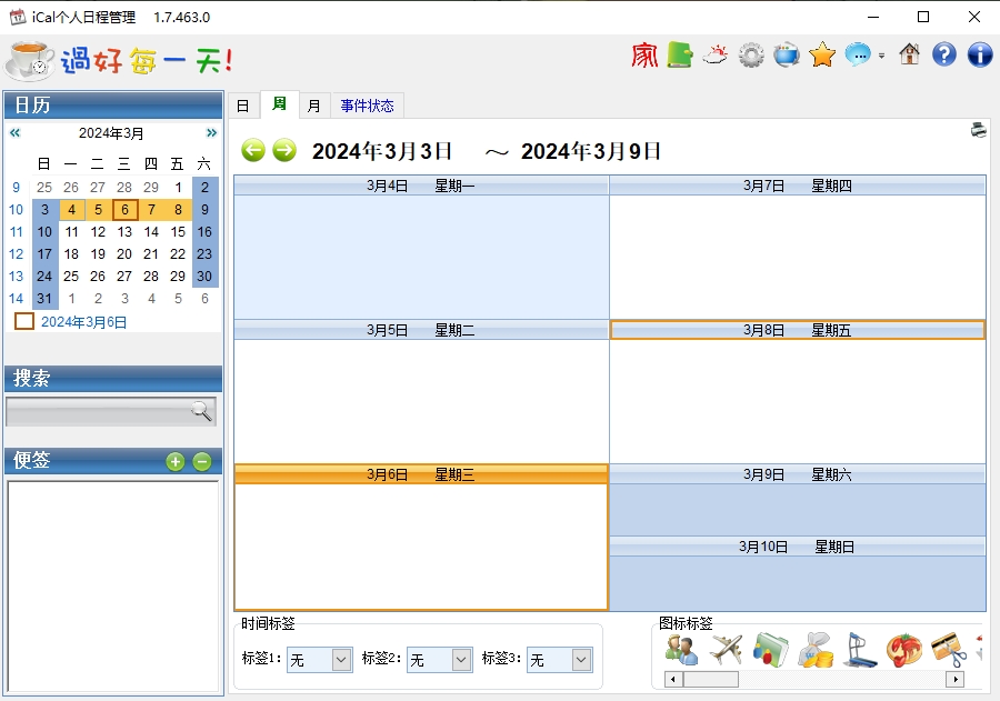 iCal个人日程管理软件是一款用于时间管理的工具,它可以帮助用户合理安排每天、每周、每月的日程。并且,它对于一些重要的事件而言,用户可以将其放在显眼的桌面以便于解决。当然,对于个人事务方面它也相当的不错,通过它你可以记录每天的事务或感受,同时以不同的颜色加以区分,甚至还可以加入各种表情哟!有需要的用户欢迎下载使用。