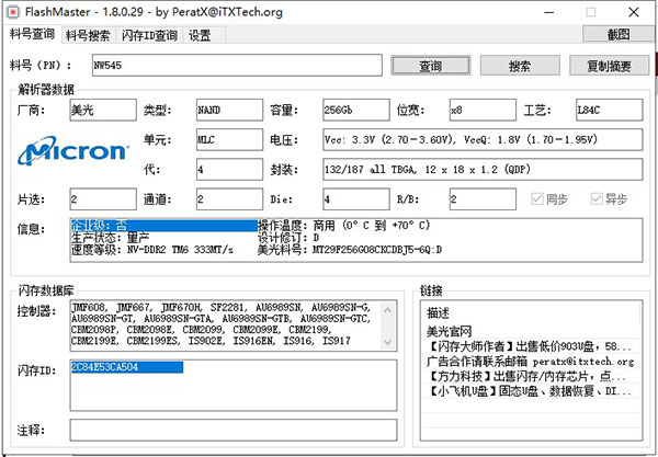FlashMaster官方版是一款可以帮助用户快速查询U盘的闪存料号的工具。由peratx和数码之家联合推出,使用后可以帮助用户快捷的查询U盘闪存信息。软件可以根据闪存上的项目号PN查询详细的闪存信息,并查看闪存制造商,类型,容量,过程,单位,电压和封装类型,通道号等多种信息。操作也是非常的简单,输入U盘的料号即可查询详细信息,目前软件支持根据料号查询、根据料号搜索、根据闪存ID查询三种查询方式。可以根据不齐的料号可以查询到可能的具体闪存料号和根据闪存id可以查询到支持此闪存的主控具体型号。并且软件承诺永久免费,而且占用的空间非常的小,使用起来非常的方便。有需要的用户可以下载体验!