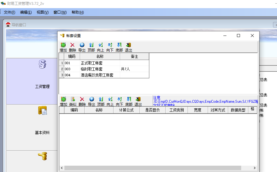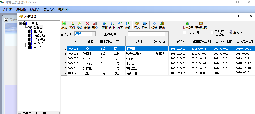 在导航栏左边,点击右键,可以增加统计分组,子分组。在导航栏右下角,可以设置人事等级,人事分类等其他配置信息。