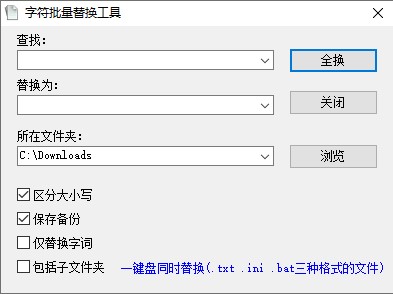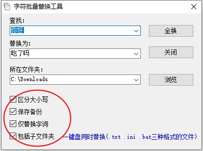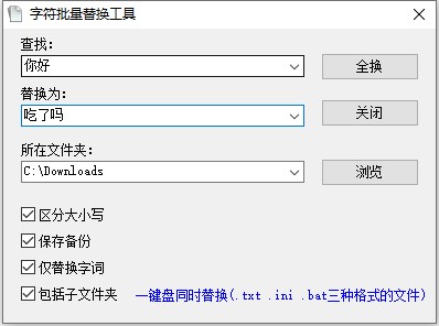还能够备份源文件,不用担心操作失误,还可以仅仅替换字符,其他的文件不进行更换,子文件则为txt,ini,bat等文件