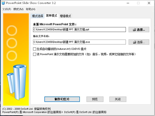 PowerPoint Slide Show Converter官方版是一款能够把ppt文件转化为exe程序的小工具。通过它你可以把做好的ppt文件转换位.exe程序,拷贝到其他电脑上,不需要下载MicroSoft PowerPoint软件了,可以直接打开文件。PPowerPoint Slide Show Converter拥有两种模式,简单模式和增强模式。满足不同人的需求。如果你有ppt文件而又不想下载MicroSoft PowerPoint,那就可以用这款软件来转换一下,就能直接打开了!有需要的朋友欢迎下载体验。