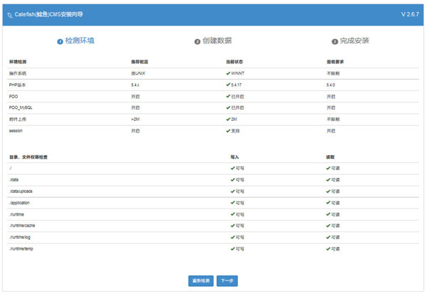 5、这是一个运行环境检测页面,如果您发现有哪个项目没有打勾,那么请重新设置您的WEB环境以符合系统需求,并重新执行安装。