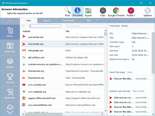 除了提取和恢复信息外,RS Browser Forensics还带有强大的分析模块。你将在一个方便的时间轴中获得用户的完整浏览历史,跟踪他们对社交网络和在线账户的使用情况,并访问他们保存的密码。