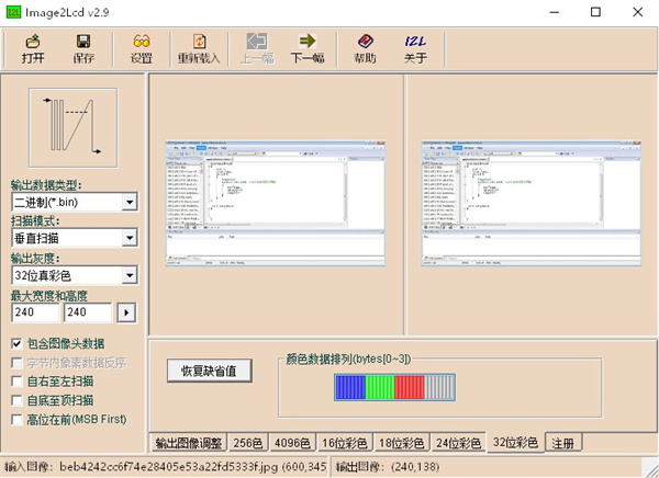 Image2Lcd官方版是一款能够将图片转换成lcd来显示的小工具。使用它只需要几个步骤就能够将各种格式的图片转化成lcd数据在电脑上展现出来,还能够调节图片的灰度,排列、亮度、对比度等、让你将图片调整的更加完美,如果喜欢可以下载使用!!