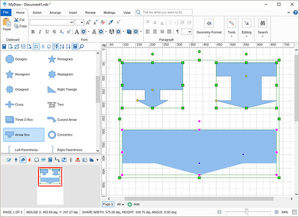 箭头框是另一个智能形状,带有2个控制手柄,其中一个控制主盒的大小,第二个控制箭头的宽度。正如您在此处可以看到的那样,只需调整控制手柄即可创建各种形状
