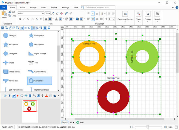 同心圆还带有两个控制手柄 - 一个负责内圆的直径,另一个 - 用于文本的位置和旋转,添加到形状中