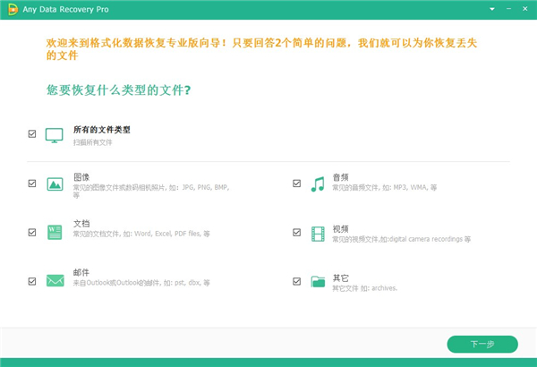 首先,选择丢失的文件类型:照片、音频、文档、视频、电子邮件或其他。默认情况下选择所有类型。单击“下一步”。