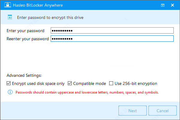 1、使用BitLocker驱动器加密加密驱动器 Microsoft未在Windows 10 / 8.1 / 8/7 Home Edition和Windows 7 Professional Edition中启用BitLocker驱动器加密功能,因此我们无法使用BitLocker驱动器加密来加密这些版本中的硬盘驱动器和USB闪存驱动器,幸运的是,您可以使用Hasleo BitLocker Anywhere在这些版本的Windows中使用BitLocker驱动器加密来加密卷 ①允许用户选择仅使用空间加密或完整驱动器加密 ②允许用户选择兼容加密模式(AES-CBC)或新加密模式(XTS-AES) ③允许用户加密Windows分区和数据分区 2、解密BitLocker加密驱动器 使用Hasleo BitLocker Anywhere,您可以在Windows 10 / 8.1 / 8/7 Home Edition和Windows 7 Professional Edition中解密BitLocker加密驱动器 3、更改BitLocker加密驱动器的密码 使用Hasleo BitLocker Anywhere,可以在Windows 10 / 8.1 / 8/7 Home Edition和Windows 7 Professional Edition中更改BitLocker加密驱动器的密码 4、导出BitLocker恢复密钥和启动密钥 使用Hasleo BitLocker Anywhere,您可以从BitLocker加密驱动器导出BitLocker恢复密钥或启动密钥(.BEK文件) 5、轻松锁定和解锁BitLocker加密驱动器 使用Hasleo BitLocker Anywhere,您可以轻松锁定或解锁BitLocker加密驱动器使用教程