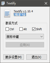 Textify是一款小巧实用的程序文本抓取器,它可以将你电脑中任何程序界面上的文本信息全部截取出来,不管是系统自带的程序还是第三方程序。你可以将其视作一款可以随意复制文本文件的软件,启动这款软件后,只要你设置好软件的使用按键,选择自己想要提取文本的位置就可以成功提取出文本。
