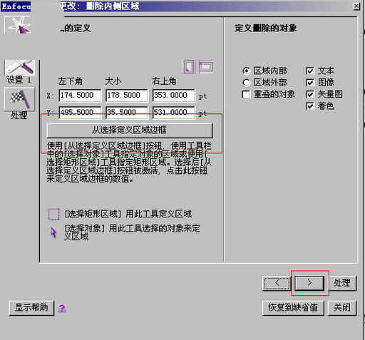 4、然后会出现下图所示界面,此时务必要点击红框所示的“从选择定义区域边框”的按钮,此处的工作指定在页面中删除内容的区域,如果没有选择的话,则是沿用上一次选择的区域。